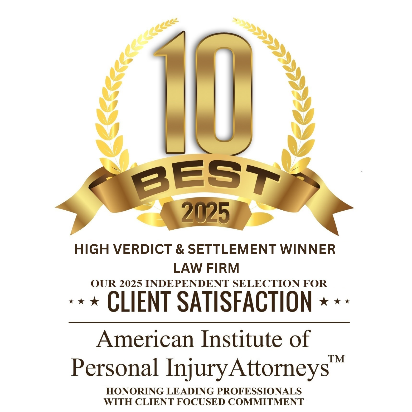 We are honored to be awarded as a Top 10 Best Law Firm for Client Satisfaction by the American Institute of Personal Injury Attorneys for 2025.